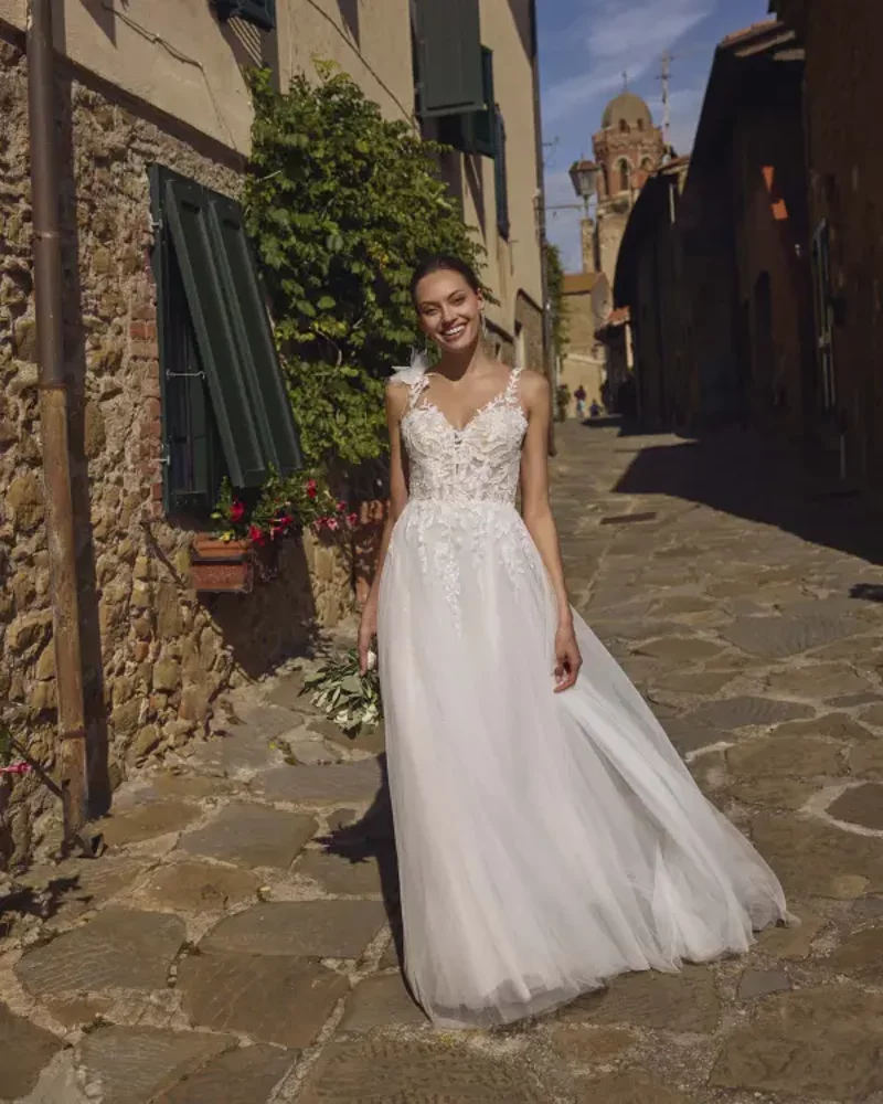Questo abito presenta uno splendido corpetto in tulle nude e applicazioni in pizzo con un profondo scollo a “V”, abbinato ad una gonna in tulle scintillante.